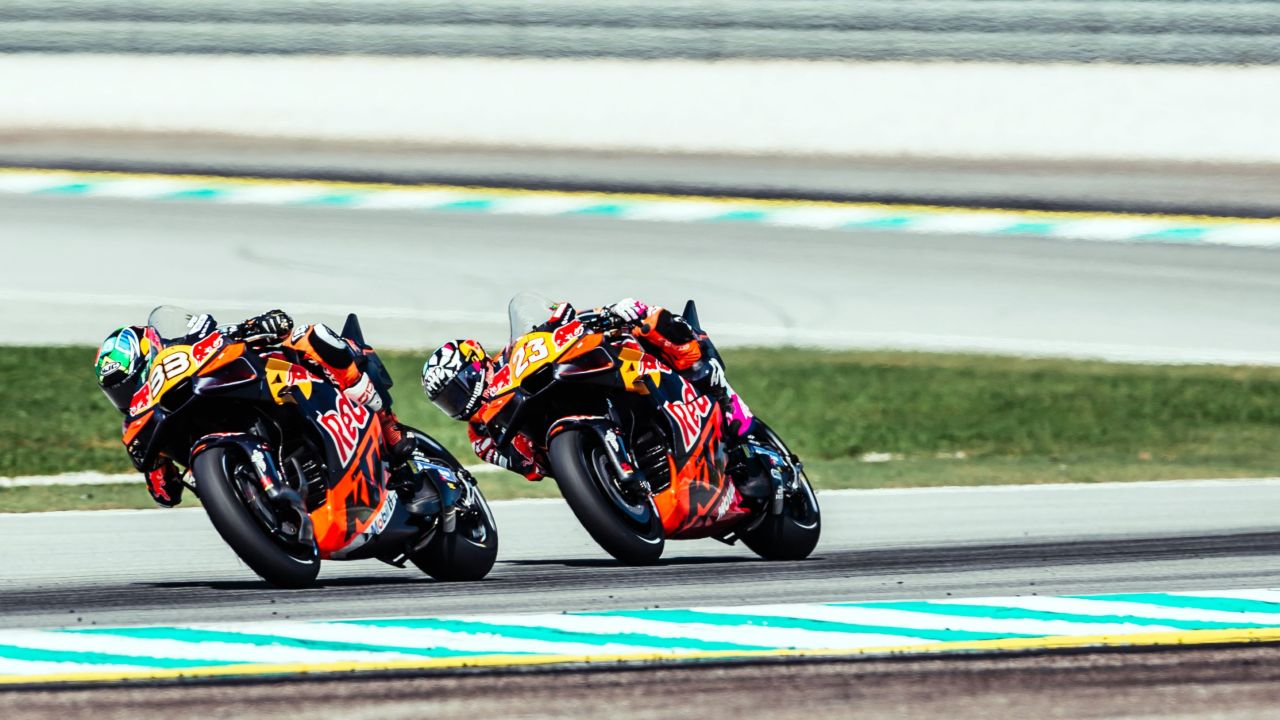 Some of the toughest race conditions of the calendar awaited the MotoGP™ grid with 35° in the air and 55° on the ground, as lights were out at 3pm local time for 20 laps. It was not the ideal start for Pol Espargaro who dropped two positions within the first corners, and he sat in 14th after one lap of racing, but he charged through Alex Rins ahead in the next lap to go up to 13th, right behind teammate Brad Binder who had taken a solid launch from 18th. The number 44 had set himself into a solid early pace, with lap 2 already in 1’59.970, as he could close the gap on Binder. On his side, Enea Bastianini had gained 3 positions within the first two laps to 16th, and lap 3 was all about the battle for 15th against Jack Miller, a battle he eventually won to settle in the point-scoring positions after 3 laps. Meanwhile, the front trio of Alex Marquez, Francesco Bagnaia and Pedro Acosta was producing amazing battles for the lead. Unfortunately, while waiting for his moment to overtake Binder, Espargaro crashed at lap 5 from 12th, a great shame for the Spaniard who had much more today. Sooo, Red Bull KTM Tech3’s hopes were now all on Enea Bastianini, who was producing an encouraging pace with a 2’00.106 on lap 4. Espargaro crashing out meant P14 after 5 laps for the 'Bestia', and next he was through Alex Rins to 13th, behind Marco Bezzecchi. At the front, Alex Marquez had come out on top with a 0.8 seconds gap on Bagnaia-Acosta, with next in 4th Fabio Quartararo 1.6 seconds behind. Halfway through the race, Bastianini was still in 13th, but with the gap now completely closed on Bezzecchi, and his better rhythm saw him eventually go through the Aprilia on lap 12. Binder was the next target, and we were up to 11th now. Luca Marini and Johann Zarco were the next victims of Enea’s remontada, as Enea was now up to 9th with just 4 laps remaining. Fermin Aldeguer’s late crash and Francesco Bagnaia’s technical issue meant two more positions were gained, as we saw Enea Bastianini crossed the finish line in 7th! It is another amazing race performance from Bastianini, as he wraps up a tricky weekend in Malaysia on a sweet note.